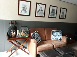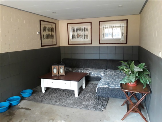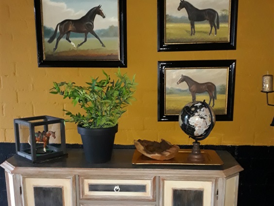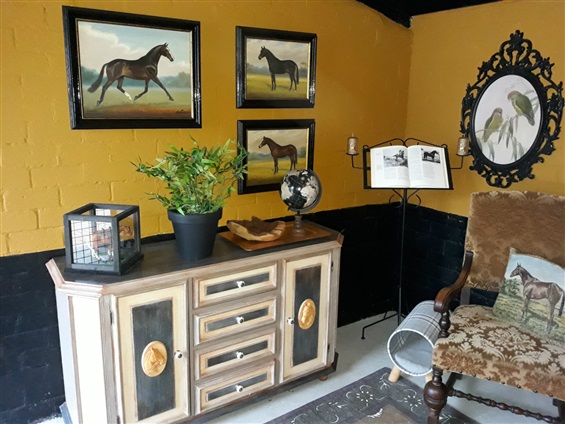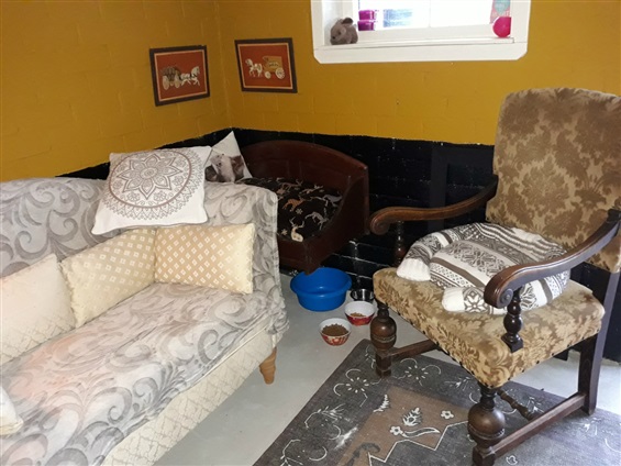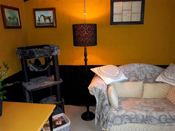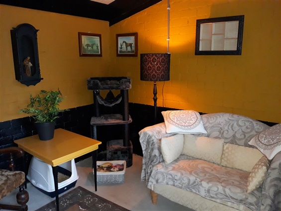 Geheel in style met het verleden van de gebouwen werd gekozen voor een paardenitem. Ik kan u verzekeren dat Els daar wel een aantal units mee zou kunnen vullen, dat is dan weer geheel in overeenstemming met haar verleden. Kitty verbleef gedurende het opleuken van haar unit tijdelijk in de Kattine want ze is niet erg gecharmeerd van tumult in haar leefomgeving. We zijn benieuwd of ze tevreden is met het resultaat. Natuurlijk hebben we ruimte voor de eventueel door haar gewenste aanpassingen. Eén aanpassing zal plaatsvinden voor haar terugkeer in haar eigen unit, namelijk een heerlijk mandje met uitzicht over het terrein. Door de enorme hoeveelheid paardenspullen die Jan en Els nog in hun bezit hadden en het anders gebruiken van de al aanwezige meubelen was dit een unit die beperkte kosten met zich meebracht. Dat was ook wel nodig want we hadden nog geen sponsoring gevonden voor deze unit. De nieuwe krabpaal hebben we bijeen gespaard met een spaarkaartenactie. Het dressoir is afkomstig van de (overleden) moeder van Bab en werd door Els opgepimpt. De grote stoelen behoorde ooit toe aan de grootouders van Els. De bank is afkomstig van vrijwilligster Miranda. Dus in dit geval konden we veel met erg weinig. De kosten van het kleed en de verf werden gedekt door een piepklein resterend bedrag van de veilingopbrengst!