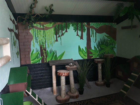 Werd gerealiseerd door onze vrijwilligers en op kosten van onze vrijwilligers. Een verrijking voor onze opvang, voor onze dieren! We hebben al wat thema’s op het verlanglijstje staan maar suggesties zijn ook welkom.